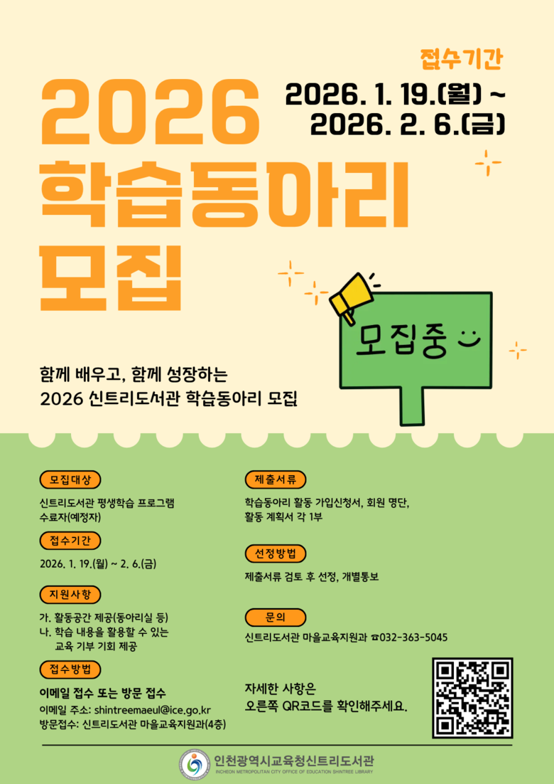 선정된 학습동아리에는 동아리실 등 활동 공간과 학습한 내용을 지역사회와 나눌 수 있는 교육기부 기회도 제공할 예정이다.