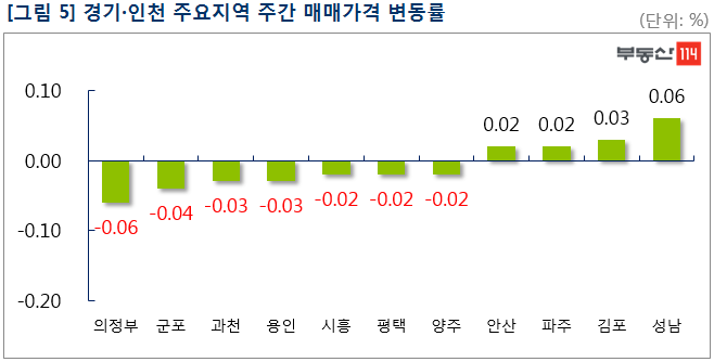 서울은 ▼양천(-0.22%) ▼중구(-0.12%) ▼강남(-0.10%) ▼동작(-0.06%) ▼강동(-0.03%) ▼노원(-0.03%) 등이 하락했다. 양천은 목동신시가지2단지, 9단지가 면적대별로 1,000만원-5,000만원씩 떨어졌다. 안전진단 강화로 재건축 추진이 요원해지면서 약세를 이어가고 있다. 중구는 5,000가구가 넘는 대단지 아파트인 신당동 남산타운이 매수 부재로 1,000만원 하락했다. 강남은 저가매물만 한 두건 거래되며 개포동 주공고층6단지가 500만원-2,500만원 하락했다. 특히 금주에는 9.13대책 이후에도 큰 가격조정 없이 버티던 압구정동 일대 아파트가 하락세를 나타냈다. 신현대 아파트가 2,500만원-1억원까지 떨어졌다. 한편, 상대적으로 집값이 저렴한 금천(0.03%)은 매매가격이 소폭 상승했다. 시흥동 벽산타운5단지가 소형 면적 위주로 500만원 올랐다.