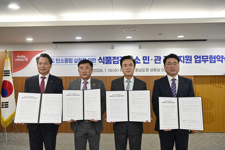 김태흠 지사는 14일 도청 상황실에서 오주현 NH농협은행 충남본부장, 윤석용 한국외식업중앙회 충남도지회장, 조소행 충남신용보증재단 이사장과 식품접객업소 민관 금융 지원 업무협약을 체결했다.
