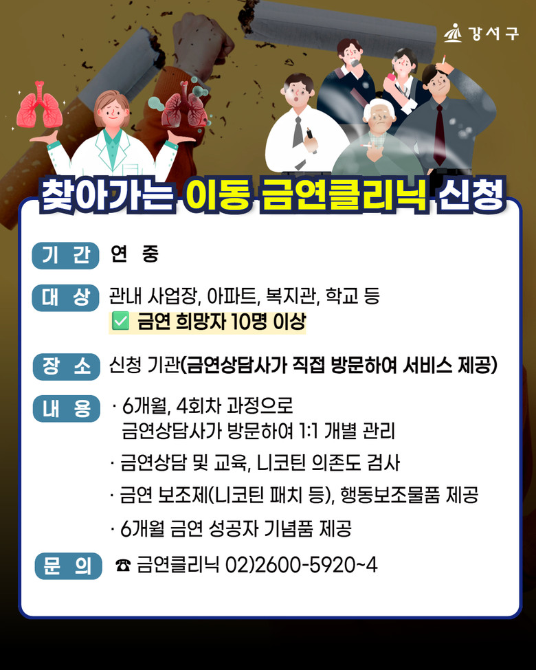 금연클리닉은 직장인·청소년 흡연자를 대상으로 평일 오전 9시부터 오후 6시까지 강서구보건소(공항대로 561)에서 진행하며, 직장인 편의를 위해 매월 둘째 주 토요일 오전 9시부터 오후 1시까지 추가 운영한다.