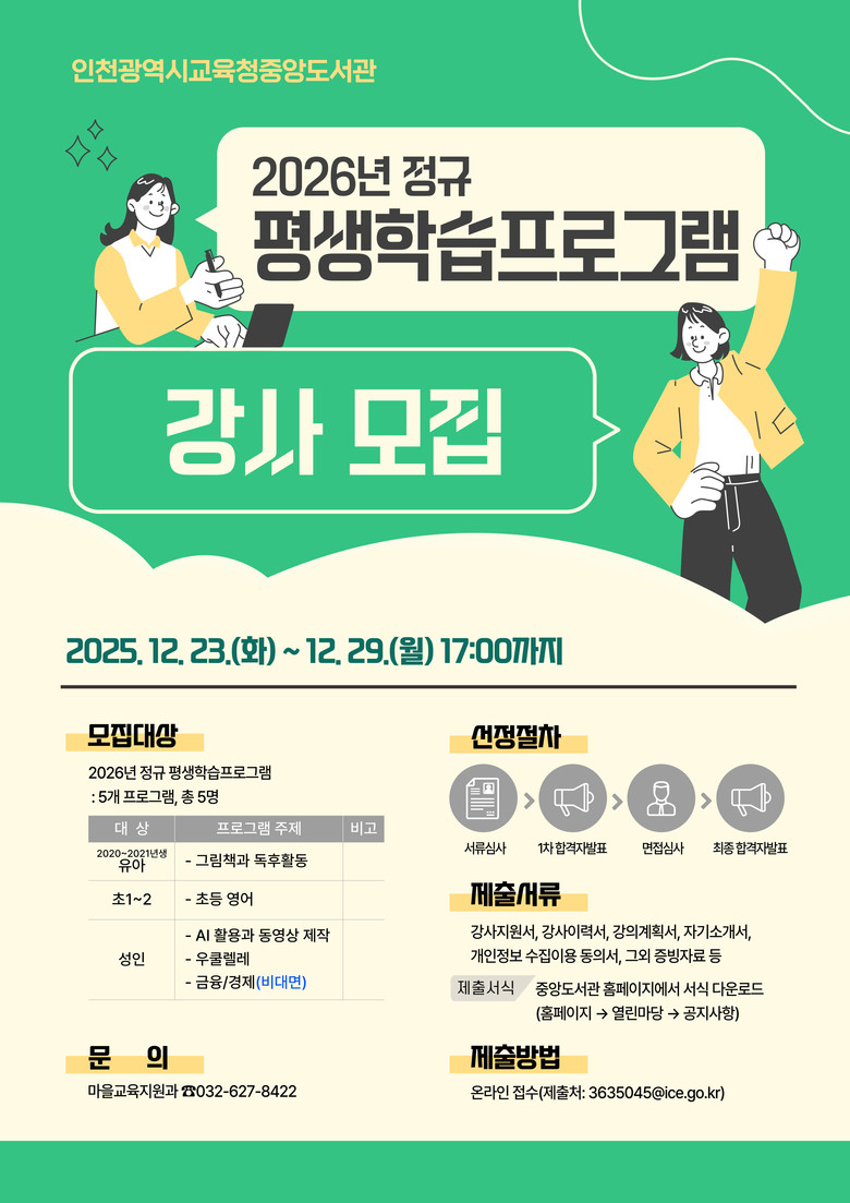 자세한 사항은 중앙도서관 누리집(lib.ice.go.kr/jungang/)에서 확인할 수 있으며, 문의는 마을교육지원과(☎032-627-8422)로 하면 된다.