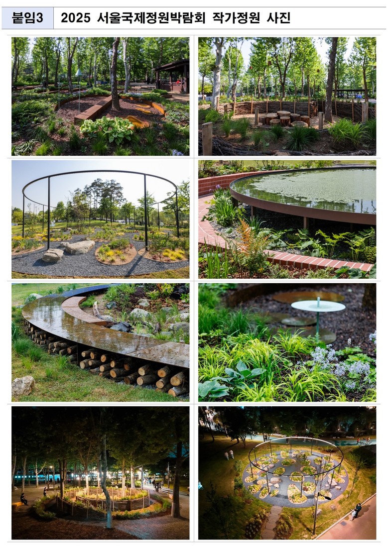 심사는 1차 서류 심사로 10팀을 선발한 후 2차 PT 심사를 통해 최종 5팀을 선정할 계획이다. 선정된 작품은 2026년 봄 서울숲 내 주요 대상지에 개소당 약 250㎡ 규모로 조성될 예정이다. 조성 후에는 내년 4월 3차 현장심사를 통해 금상·은상·동상을 선정해 2026 정원박람회 개막식 당일 시상할 예정이다.