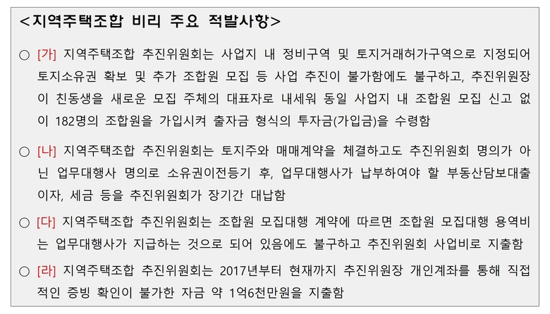 ▴총회의결 미준수.해산총회 미개최 등 57건은 시정명령 후 미이행 시 고발 ▴자금보관 대행 위반, 조합 가입계약서 부적정 등 44건은 과태료 부과 ▴연락두절.사업중단 등으로 실태조사 미실시 고발 15건 ▴수사의뢰 14건 등 조치키로 했다.