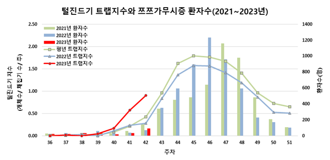 [세계타임즈 = 이채봉 기자] 질병관리청(청장 지영미)은 10월 27일(42주차) 현재 쯔쯔가무시증(Scrub Typhus) 주요 매개체인 털진드기의 트랩지수가 0.91로 평년 동기간 대비 2배 이상 증가하여, 야외 활동 시 털진드기 물림 주의가 필요하다고 밝혔다.