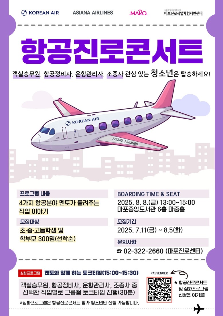 - 대한항공·아시아나항공 현직자 강사로 참여.. 생생한 진로 정보 제공 [마포구 세계타임즈=이장성 기자] 마포구(구청장 박강수)는 청소년들에게 항공 분야에 대한 생생한 진로 정보를 제공하기 위해 8월 8일 오후 1시, 마포중앙도서관 6층 마중홀에서 ‘2025 항공진로콘서트’를 개최한다.