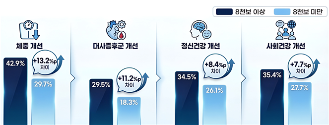 손목닥터9988 앱 이용자 설문조사 분석 결과에 따르면, 월평균 8,000보 이상을 걷는 이용자의 건강 개선 효과가 뚜렷하게 나타났다. 특히 8,000보 이상 걸은 이용자의 체중 개선 효과는 그렇지 않은 사람보다 13.2%P 높았으며, 대사지표 개선 효과도 11.2%P 높았다.