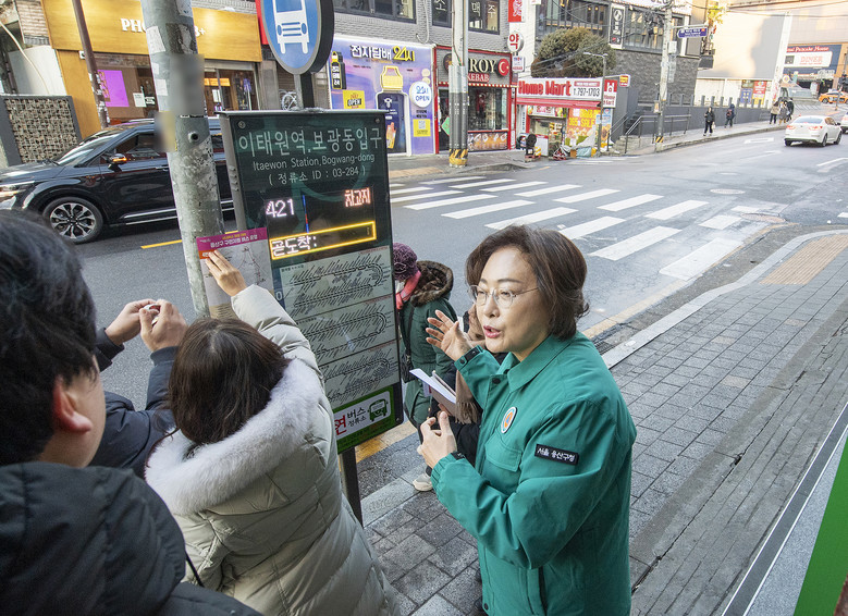 | ▲ 박희영 용산구청장이 이태원역 인근 버스정류장을 방문해 구민지원버스 노선표 부착 상태 등을 점검하고 구민들에게 버스 이용에 대해 안내하고 있다. |