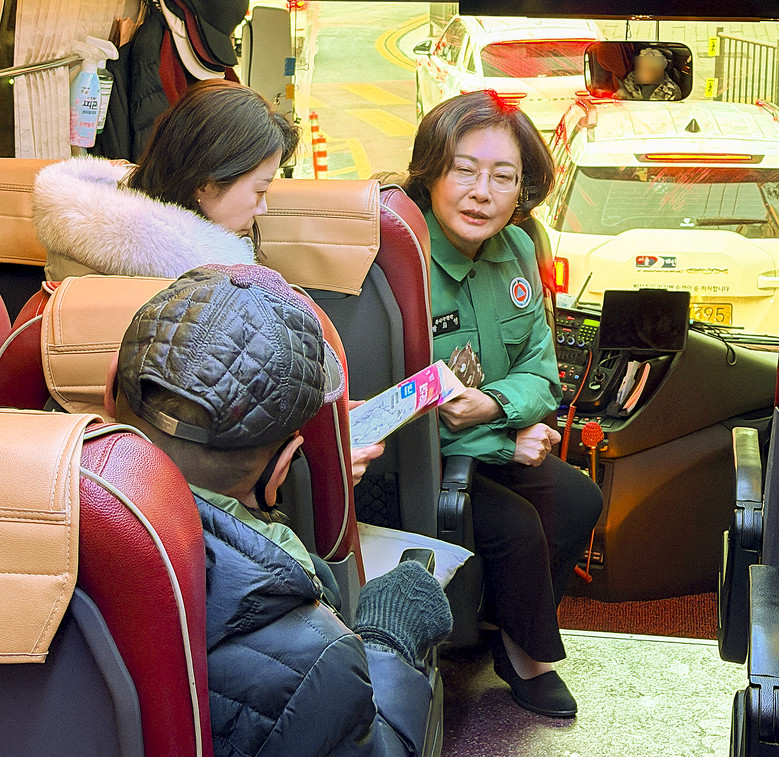 | ▲희영 용산구청장이 14일 ‘2번 구민지원버스’를 탑승해 구민들과 대화하며 이용 불편 사항을 점검하고 있다. |