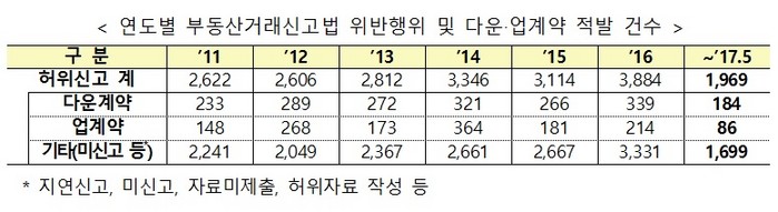 국토부는 또한 올 초부터 5월 까지 전국을 대상으로 부동산 실거래가 신고내역에 대해 정기적인 모니터링을 실시해 총 6414건의 분양권 다운계약 의심사례를 지자체에 통보해 조사 중이다. 이 중 다운계약 혐의가 특히 높은 538건은 국세청에도 통보했다.