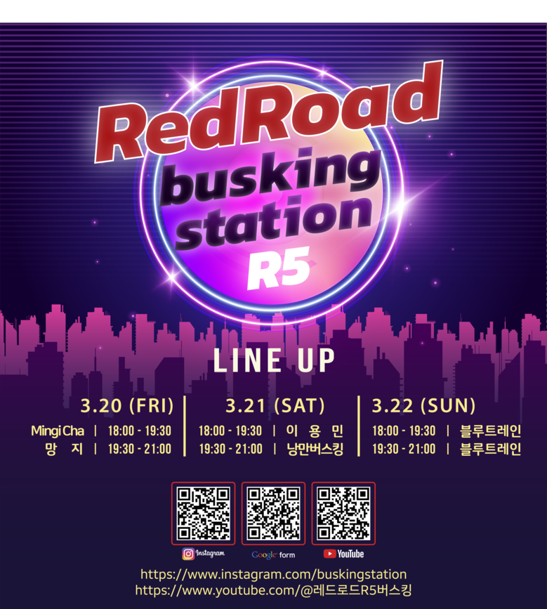 3월 20일부터 22일까지 레드로드 R5 버스킹존에서는 오후 6시부터 9시 보컬과 댄스 등 다채로운 장르의 공연이 시간대별로 펼쳐져 주말 내내 방문객의 발길을 사로잡을 예정이다.