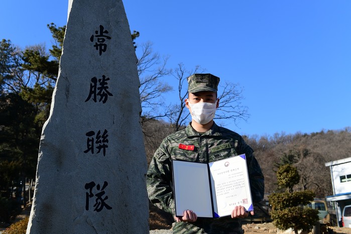 | ▲ 해병대 2사단 5여단 정보중대 이재진 병장이 한 손에 자원병역이행 명예증서를 들고 파이팅을 외치고 있다. ▲촬영: 하사 최태준 |