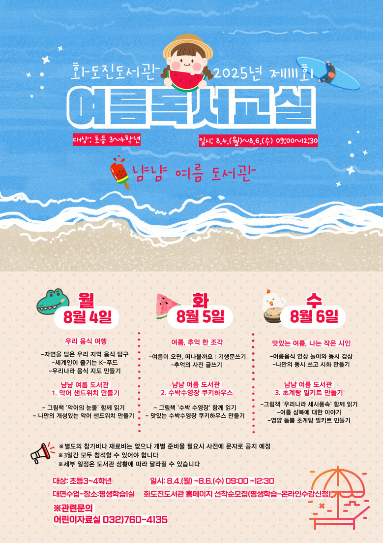 자세한 사항은 화도진도서관 어린이자료실(☎032-760-4135)로 문의하면 된다.