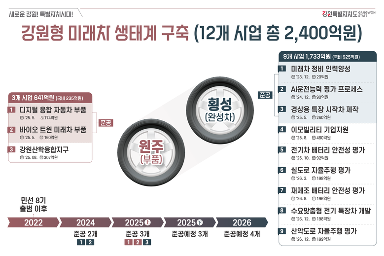도는 원주와 횡성을 거점으로 총 2,400억 원 규모의 4대 전략 12개 사업을 추진하고 있으며, 이를 통해 자율주행차 실증과 전문인력 양성 기반을 단계적으로 구축하고 있다.