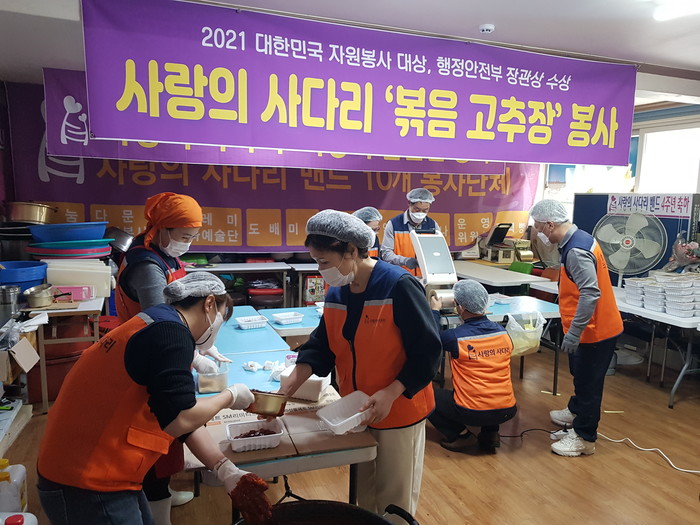 [대전=세계타임즈 이채봉 기자] 6년째 꾸준히 대전시 소외계층을 위해서 다양한 봉사를 펼치고 있는 대전시 봉사단체 사랑의 사다리 밴드(리더 이정제)는 2일 오전9시~오후12시, 볶음 고추장 120개를 만들어서 대전시장애인주간보호센터 6곳에 전달을 하였다.