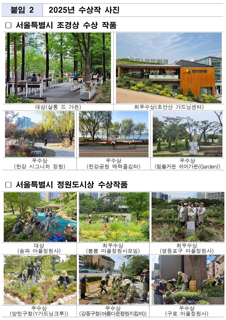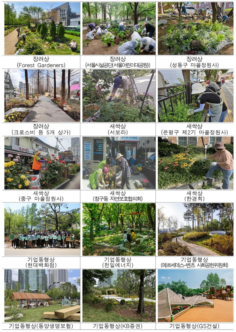 정원도시상 최우수상을 수상한 ‘봄봄 마을정원사 모임’은 7년째 주민들이 자발적으로 가꿔온 2,640㎡(800여평)규모의 공유정원으로 대표적 시민주도 정원 조성 사례다. 지역 공동체 형성과 생태적 관리 모델을 성공적으로 보여준 점이 높게 평가되었다. 역시 최우수상을 수상한 ‘영등포구 마을정원사’는 지역 자투리땅과 골목, 도시텃밭까지 다양한 생활공간을 재해석하여 주민 참여형 정원 조성의 새로운 모델을 제시해 수상작으로 선정됐다.