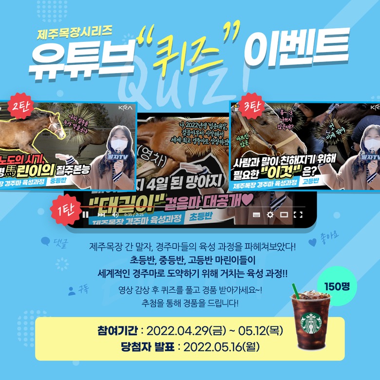 한편, 한국마사회는 이번 경주마 육성과정 영상 공개에 맞춰 대국민 퀴즈 이벤트를 시행한다. 유튜브에서 ‘마사회TV’ 채널을 구독하고, 영상을 시청한 다음 퀴즈 정답을 설문 폼에 입력하면 응모가 완료된다. 이벤트 기간은 4월 29일부터 5월 12일까지 2주간 진행되며 추첨을 통해 총 150명에게 커피 기프티콘을 증정한다.
