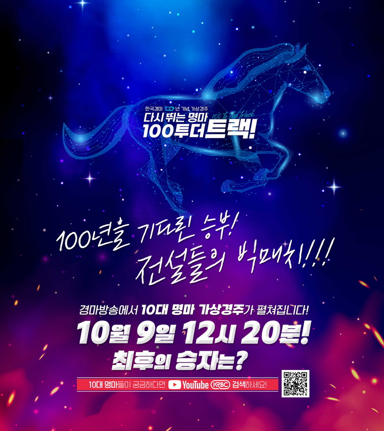[세계타임즈 = 심하린 기자] ‘포경선’, ‘가속도’, ‘대견’, ‘돌콩’까지. 한국경마 100년을 빛낸 전설의 경주마들이 한 자리에 모인다. 오는 9일 한국마사회(회장 정기환)는 한국경마 100년을 기념해 10대 명마를 선정하고 최강의 경주마를 가리는 가상경주를 시행한다. 3D로 제작된 이번 영상은 KRBC 유튜브 라이브를 통해 생중계되며 현장에서도 방영될 예정이다.