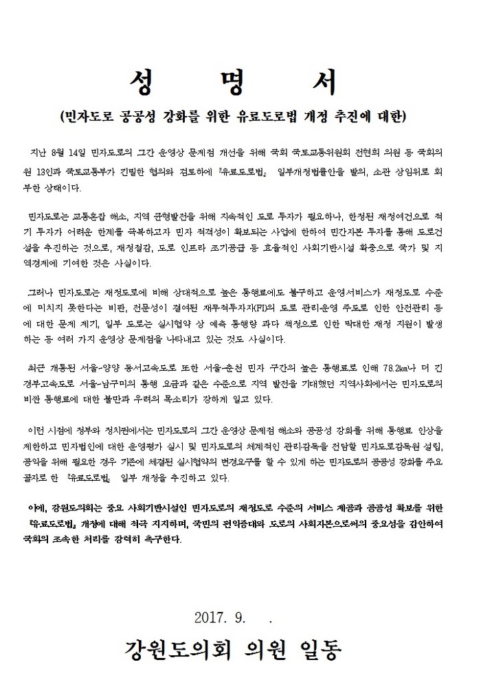 [세계타임즈 김민석 기자] 지난달 국회 국토교통위원회 전현희 의원 등 국회의원 13인이 발의한『유료도로법』일부개정법률안에 대하여, 강원도의회는 민자도로감독원 설립, 통행료 인상 제한, 민자법인 운영평가 등을 주요내용으로 하는『유료도로법』일부개정법률안에 대하여 민자도로의 그간 운영상 문제점 개선 및 민자도로의 재정도로 수준의 서비스 제공과 공공성 확보를 위한 개정안에 대해 적극적인 지지와 함께, 국민의 편익증대와 도로의 사회자본으로써의 중요성을 감안하여 국회의 조속한 처리를 촉구하는 성명서를 9.21일 발표하고 전달하였다.
