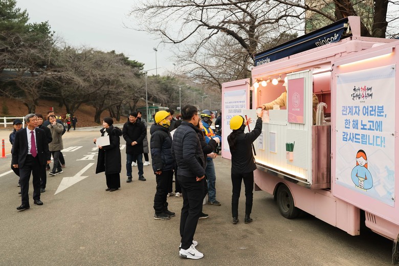 [세계타임즈 = 송민수 기자] 한국마사회 정기환 회장은 지난 6일, 동이 트는 새벽에 렛츠런파크 서울 경주마 조교 현장을 찾았다. 현장을 방문한 정 회장은 혹한기에도 새벽부터 구슬땀을 흘리는 마필관리사, 조교사, 기수 등 경마관계자들을 격려했다. 이 날 현장에는 한국마사회 임직원의 응원이 담긴 커피차 2대가 도착해, 조교를 마친 관계자들에게 따듯한 음료를 선물했다. 이와 함께 한국마사회 기관 비전과 핵심가치(혁신선도, 소통·협력, 윤리·청렴)문구가 적힌 핫팩을 배부하며 온기를 전했다.