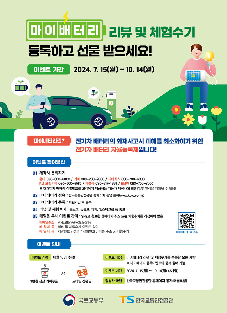 TS는 마이배터리 서비스에 대한 국민 참여도를 높이기 위해 오는 10월 14일(월)까지 ‘전기차 배터리 식별번호 마이배터리 리뷰 및 체험수기 이벤트’를 개최한다고 밝혔다.