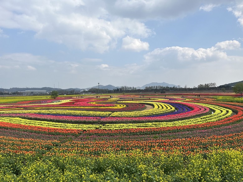 특히 튤립 150만 본과 봄꽃 53만 본으로 그려낸 '100년 전 동천 곡류하천'과 '순천만 갯골' 형상은 순천의 과거와 현재, 미래를 담았다.