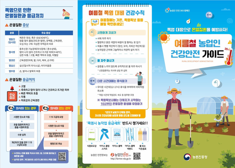 또한, 1~2시간마다 반드시 작업을 멈추고, 그늘진 곳이나 냉방이 가능한 장소에서 15분 이상 휴식을 취해 체온을 조절해야 한다. 농작업 시에는 모자, 팔토시, 통풍이 잘되는 작업복 등 폭염 대비에 적합한 복장을 착용하는 것도 중요하다.