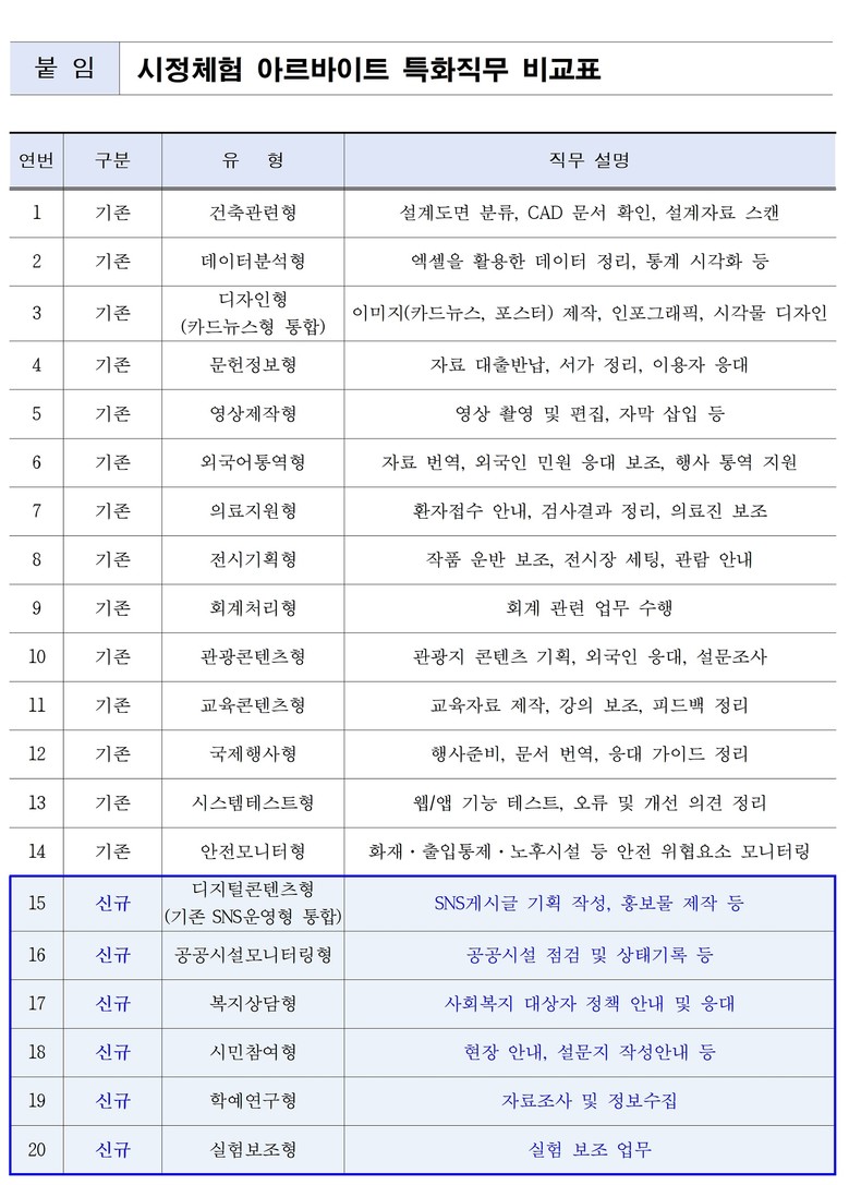 ○ (특화직무) 총 20개 유형으로 구성되며, 최근 시정환경 변화와 부서 수요에 따라 기존 직무외에도 공공시설모니터링형·복지상담형·실험보조형 등을 추가 발굴하여 청년들의 전공과 전문성이 행정 실무에 접목될 수 있도록 하였다.