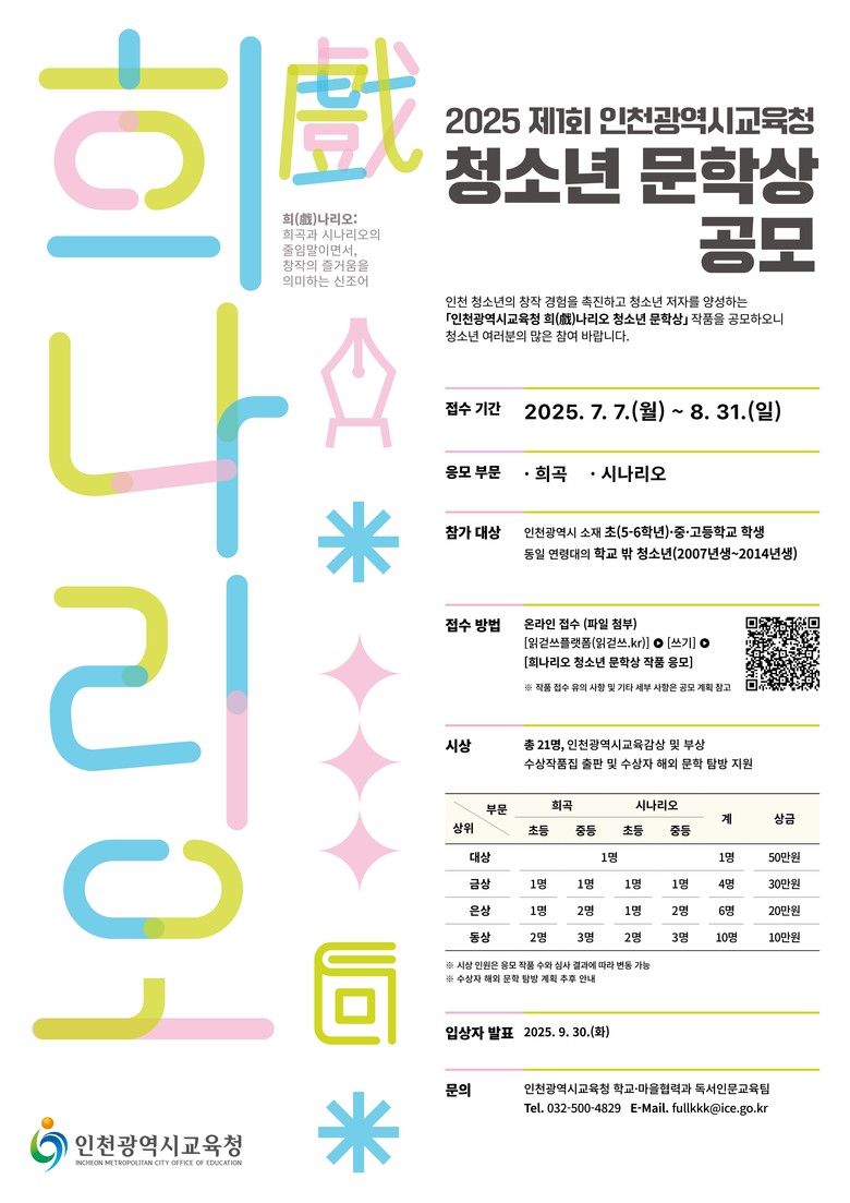 인천시교육청 관계자는 “이번 문학상이 청소년들이 글쓰기의 즐거움을 경험하고 작가로 성장하는 계기가 되길 바란다”며 “앞으로도 청소년이 창의력과 상상력을 펼칠 수 있도록 창작 기회를 확대하겠다”고 전했다.