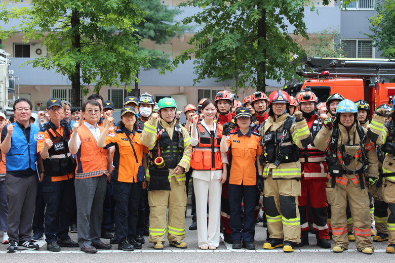 ‘소방차 길 터주기’ 훈련 후 선사현대아파트에 가상의 화재 발생을 가정한 화재 진압 훈련도 실시하였다. 출동한 굴절차와 고가차에서 고압의 물을 동시에 뿜어내고 의용소방대와 자위소방대 대원들은 신속하게 요구조자들을 이동시키며 응급조치를 실시하는 훈련이 일사불란하게 진행됐다.
