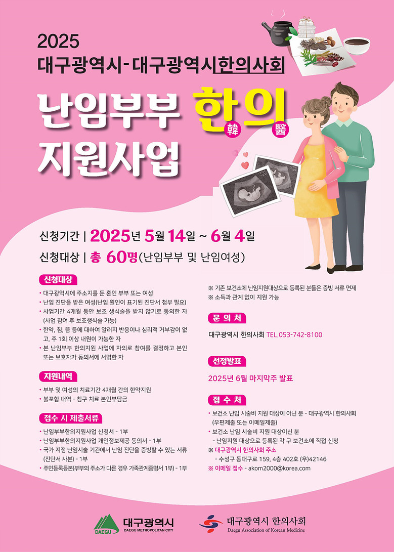 대구시에 주민등록이 되어 있는 난임부부 또는 난임 여성이라면 누구나 신청할 수 있으며, 참여를 희망할 경우 6월 4일(수)까지 신청서와 구비서류*를 관할 보건소 또는 대구광역시 한의사회에 이메일로 제출하면 된다. 자세한 내용은 대구광역시 홈페이지 공지사항에서 확인할 수 있다.