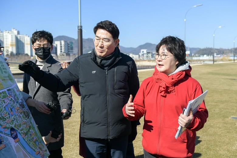 또 순천시가 본격 추진할 애미메이션 클러스터 예정지 및 조수진 의원의 적극적인 노력으로 특별교부세 19억 원을 지원 받은 강변로 그린아일랜드 현장을 찾았다.(사진 순천시 제공)