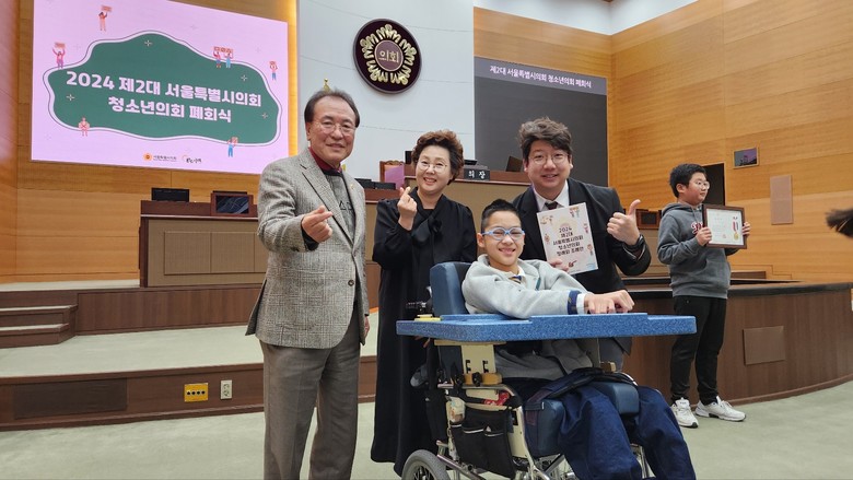 ▲ 제2대 청소년의회 폐회식 당시 기념사진. 이종환 부의장(좌) 조 의원 어머니(중좌), 조온유 청소년의원(중우), 문성호 서울시의원(우) |