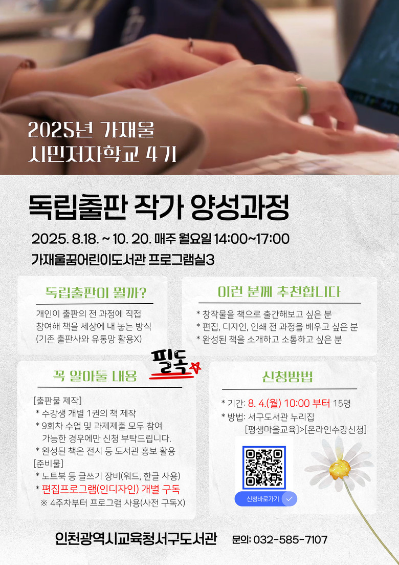 [인천 세계타임즈=심하린 기자] 인천광역시교육청서구도서관(관장 정연순)은 가재울 시민저자학교 4기 프로그램으로 ‘읽걷쓰 독립출판 작가 양성과정’을 운영한다.