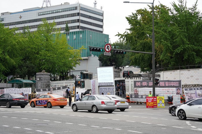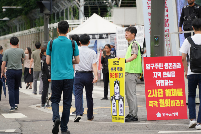 [양구군=세계타임즈 김민석 기자] 이상건 양구군의회의장이 29일 서울 용산 국방부 정문에서 2사단 해체철회 피켓을 들고 1인시위를 하고 있다.