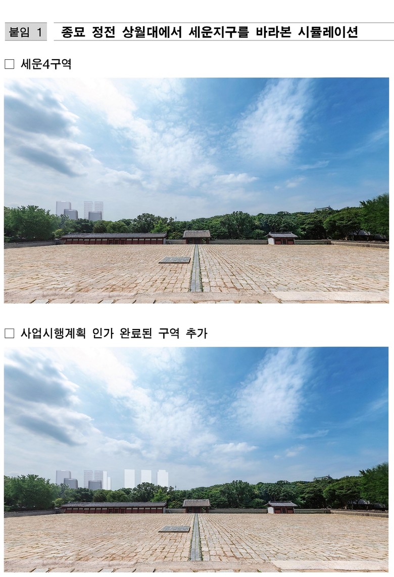 세운지구는 종묘 문화재 보호구역으로부터 약 180m 이격되어 있어 역사문화환경보존지역에 포함되지 않는다.