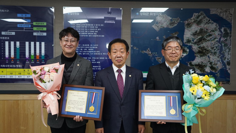 [강화군 세계타임즈=심하린 기자] 강화군의회 오현식, 한승희, 박흥열 의원이 29일 대한민국시군자치구의회의장협의회 및 인천광역시군구의회의장협의회로부터 지방의정봉사상을 받았다.