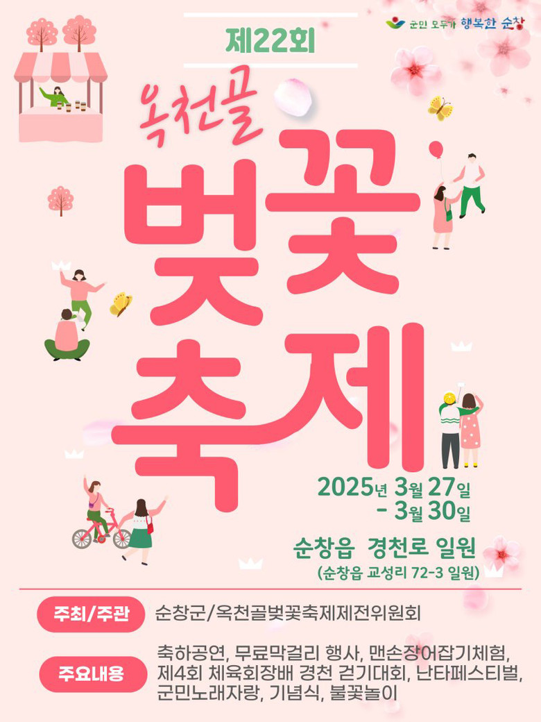 올해로 22회를 맞이하는 이번 축제는 순창군이 주최하고 옥천골벚꽃축제제전위원회가 주관하며, 매년 많은 사람들이 찾는 인기 축제인 만큼 올해도 더욱 알차고 다양한 프로그램들로 방문객들을 맞이할 예정이다.