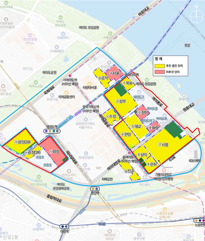 서울시는 2026년 상반기까지 여의도 일대 12개 재건축 단지의 정비계획 결정을 목표로 속도를 높이고 있다. 목화아파트는 7번째 사업이다. 앞서 정비계획이 결정된 6개 단지 중 대교·한양아파트는 사업시행계획 인가를 받았고, 시범·공작아파트는 통합심의 준비, 진주·수정아파트는 조합설립을 준비 중이다.