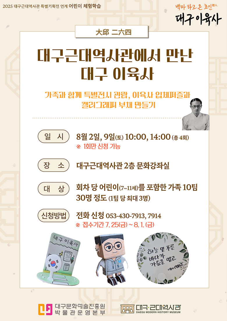 ▸ 전시 관람, 입체 퍼즐, 캘리그라피 부채 만들기 등 진행 [세계타임즈=대구 한윤석 기자] (재)대구문화예술진흥원(원장 박순태) 박물관운영본부 소속 대구근대역사관은 현재 성황리에 개최 중인 광복 80주년 기념 특별기획전 ‘백마 타고 온 초인(超人), 대구 이육사’ 연계 행사로 어린이를 위한 ‘대구근대역사관에서 만난 대구 이육사’ 체험학습을 8월 2일(토)과 9일(토) 양일에 거쳐 총 4회 운영한다.