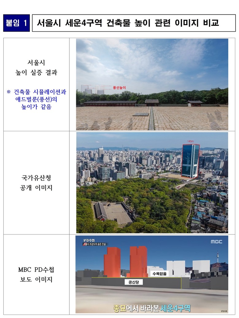 서울시가 현장에 설치한 애드벌룬은 해당 건축물의 실제 높이를 객관적으로 보여주는 수단입니다. 이 높이가 종묘 정전에 어떠한 영향을 실질적으로 미친다는 것인지, 국가유산청은 구체적이고 객관적인 근거를 제시해야 할 것입니다.