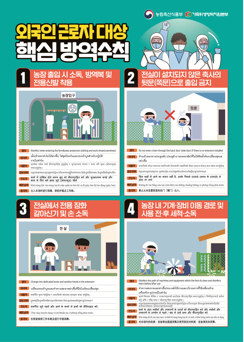 정비된 외국인 근로자와 고용 농장주를 대상으로 다국어로 된 방역수칙 홍보 리플릿 배부 및 문자 발송, 외국인 근로자용 영상 등을 활용하여 방역 교육을 실시하고, 아프리카돼지열병 등 가축전염병 현장 방역 점검에서 외국인 근로자 고용 농장에 대해 외국인 근로자 신고 사항과 방역관리 등을 중점 점검할 방침이다.