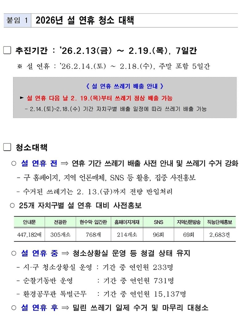 한편 연휴가 끝난 19일(목)부터는 자치구별로 청소 인력과 장비를 총동원해 연휴 기간 중 밀린 쓰레기를 일제 수거‧처리하고 자치구 여건에 따라 주민들과 함께 설 마무리 청소를 병행 실시할 계획이다.