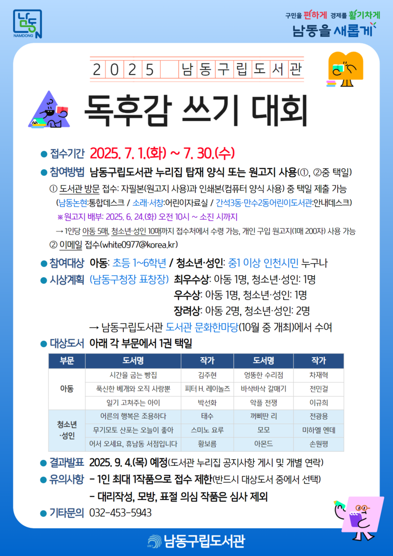 응모 분야는 아동(초등1~6학년)과 청소년·성인의 2개 부문이고, 선정 도서 중 한 권을 읽고 정해진 양식에 독후감을 작성해 대면(남동논현, 소래, 서창, 간석3동, 만수2동도서관) 또는 이메일(white0977@korea.kr)로 제출하면 된다.