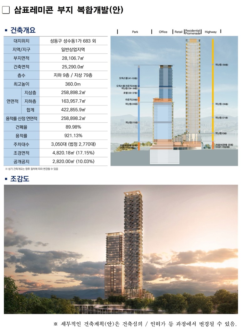 이번 지구단위계획에 따르면 해당 부지는 최고 79층 규모 업무.주거.상업 기능이 융합된 복합단지로 개발된다. 성수 지역 업무기능 강화를 위한 업무시설 의무 비율이 35% 이상 적용되고 직주근접을 실현해 줄 주거시설(40% 이하), 상업.문화시설도 함께 들어선다.