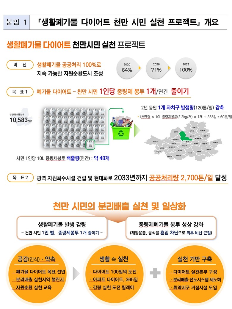 서울시는 이달부터 「생활폐기물 다이어트 천만 시민 실천 프로젝트」를 본격 추진에 들어간다고 밝혔다. 시는 시민 참여를 토대로 종량제 폐기물 발생을 줄이고, 제도.인프라 개선도 병행해 2033년 생활폐기물 공공처리 100% 기반 마련을 목표로 추진할 방침이다.