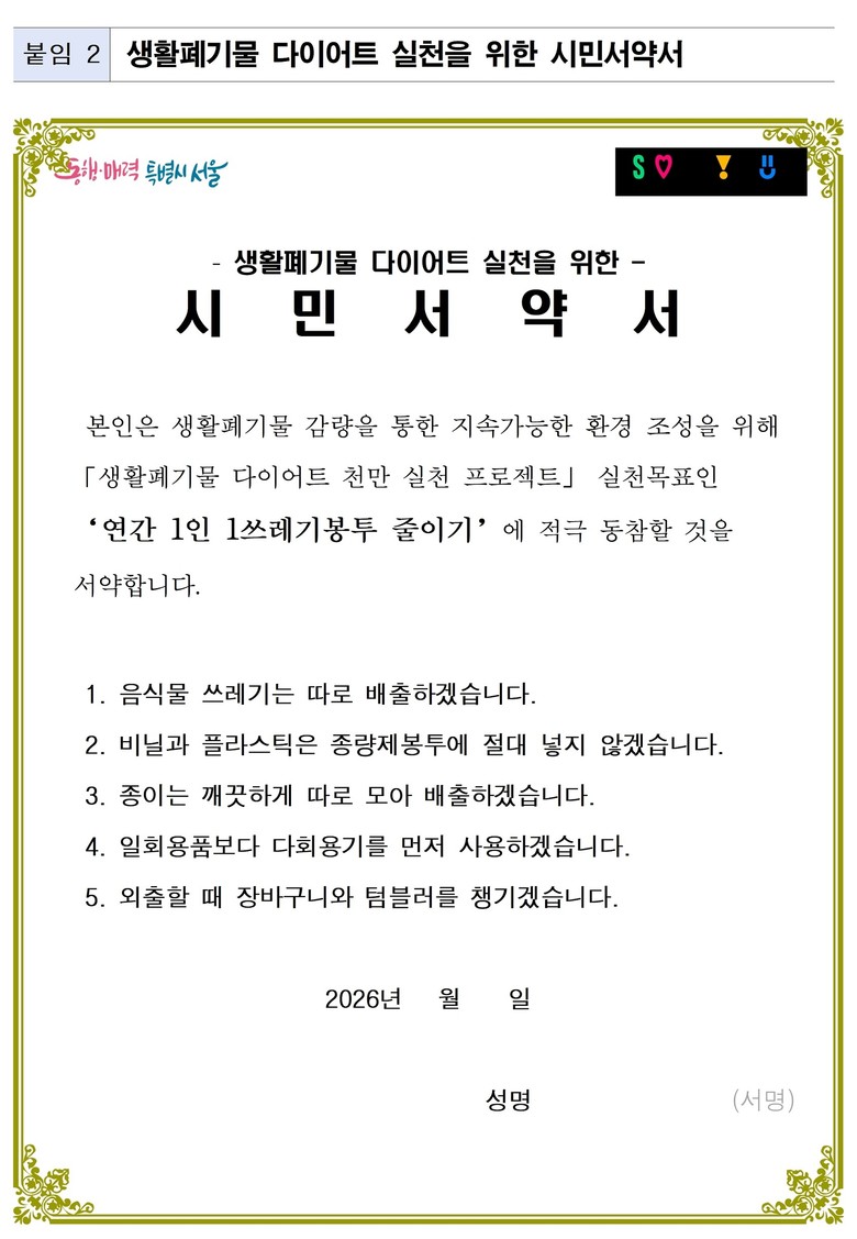 시민 실천서약은 ▴음식물쓰레기 분리배출 ▴비닐.플라스틱 종량제봉투 혼입 금지 ▴종이류 분리배출 ▴다회용기 우선 사용 ▴장바구니.텀블러 지참 등 실생활에서 참여할 수 있는 항목으로 구성될 예정이다.