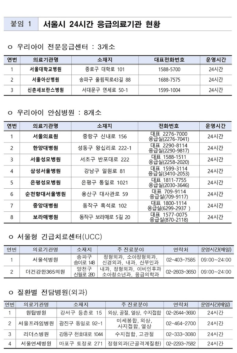 서울시는 연휴 기간 응급의료기관 51개소와 응급실 운영병원 21개소 및 ‘우리아이 안심병원(경증·준응급)’ 8곳과 ‘우리아이 전문응급센터(중증·응급)’ 3곳도 24시간 운영한다.