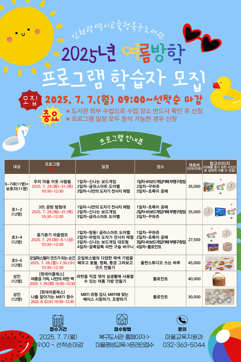 참여 신청은 7월 7일 오전 9시부터 북구도서관 누리집(https://lib.ice.go.kr/bukgu/index.do)에서 선착순 모집하며, 자세한 사항은 북구도서관 누리집을 참고하거나, 마을교육지원과(☎032-363-5044)로 문의하면 된다.