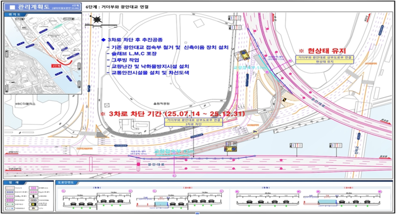 이번 교통통제는 ▲기존 광안대교 접속 구간 철거 ▲신축 이음장치 설치 ▲특수콘크리트(L.M.C*) 교면포장 ▲안전 시설물 설치 등 작업 공간 확보와 건설노동자 및 주행차량 안전사고를 예방하기 위해 실시된다.