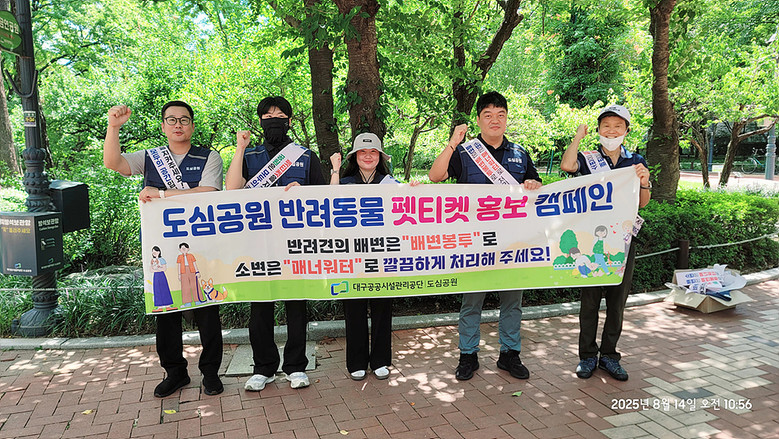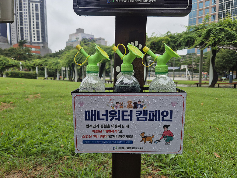공단은 캠페인과 함께 국채보상운동기념공원을 포함한 도심공원 6곳에 ‘매너워터’를 비치했다. 매너워터는 반려견이 소변을 본 자리에 뿌려 악취를 줄이고 흔적을 씻어내는 휴대용 물로, 시민들이 자율적으로 사용할 수 있도록 하고 있다.